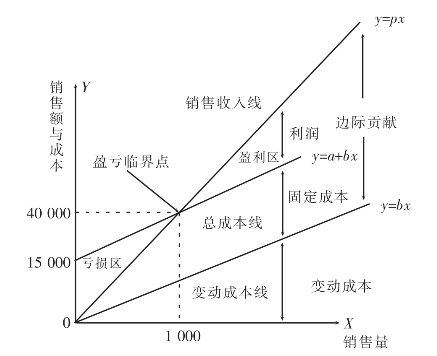 3.绘制销售收入线。销售收入线与变动成本线之间区域即为边际贡献。