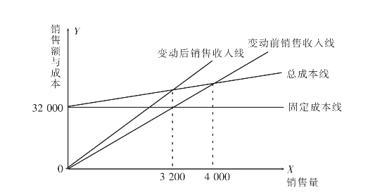 单位产品销售价格(以下简称“单价”)的变动是影响盈亏临界点的一个重要因素。在盈亏临界图上,基于一定的成本水平,单价越高,表现为“销售总收入线”的斜率越大,盈亏临界点就越低,同样销量所实现的利润就越多。单价变动对盈亏临界点的影响如图4-4所示。设例4-8中产品单价由原来的20元变为22元,则盈亏临界点销售量为3 200件。