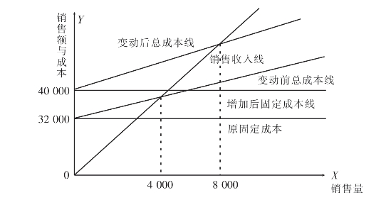 固定成本的变动在盈亏临界图上表现为销售总成本线的整体平移。在其他因素不变的情况下,固定成本越大,销售总成本线越高,相应地,盈亏临界点也越高,同样销量所实现的利润就越少。固定成本变动对盈亏临界点的影响如图4-6所示。设例4-8中产品固定成本由原来的3 200元变为4 000元,则盈亏临界点销售量为5 000件。