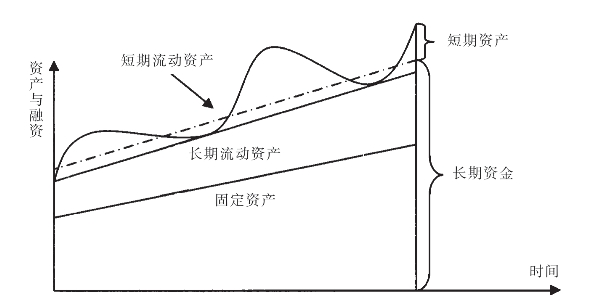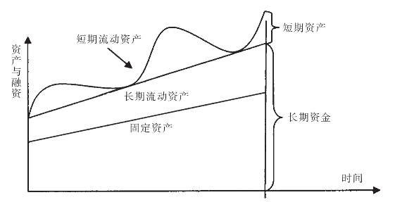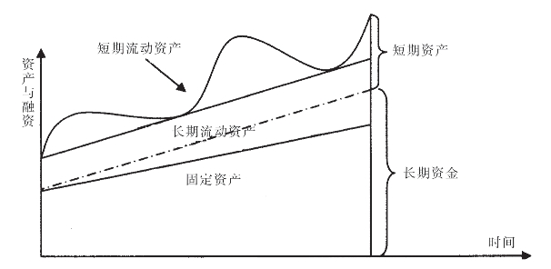 进取型筹资组合如图5-3所示。以长期融资方式融通的资金(虚线)在长期流动资产(实线)以内,说明公司以长期融资方式筹集的资金不能满足长期流动资产的需要,要靠大比例的短期负债来融通资金。短期筹资方式的利率的变动性加大了公司的盈利,但也给公司带来了到期偿债风险。所以,该组合适用于短期资本比较少的公司。