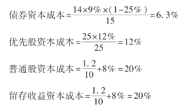 〔例6-3〕某企业计划筹集资金100万元,所得税税率25%,有关资料:①向银行借款10万元,利息率7%;②按溢价发行债券,面值14万元,发行价格15万元,票面利率9%,期限5年,年付息;③发行优先股25万元,预计年股利率为12%;④发行普通股40万元,每股发行价格10元,预计第一年股利1.2元,以后每年按8%增长;⑤其余所需资金通过留存收益取得。