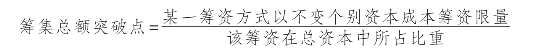 筹资突破点即以不变资本成本筹资总量,筹资总额突破点等于某一筹资方式以不变个别资本成本筹资限量除以该筹资方式在总资本中所占比重,这是因为追加筹资以保持特定的资本结构为前提。用公式表示如下: