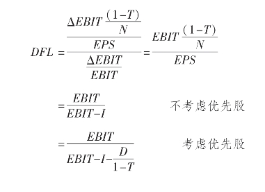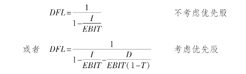 从上式也可看出其他财务因素对DFL 系数的影响。在其他因素不变的情况下,财务杠杆与息税前利润EBIT反方向变动;在其他因素不变的情况下,财务杠杆与所得税率T正方向变动。