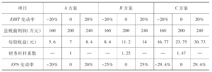 例6-7中,如果息税前利润分别上升20%、下降20%,则三个方案每股收益如表6-7所示。