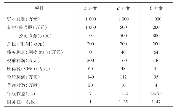 〔例6-7〕某公司为筹建项目筹资1 000万元,有三个筹资方案可供选择:(1)全部发行普通股;(2)发行普通股500万元,发行债券500万元;(3)发行普通股200万元,发行债券800万元。
