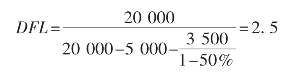 〔例6-6〕假设某公司资本来源如下:债券100 000万元,年利率5%,优先股500股,每股面值100元,年股利率7%,该公司的普通股为500股,每股收益8元,所得税率50%。则息税前利润为20 000万元时,财务杠杆系数计算如下: