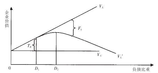 图中说明如下:(1)VU为无负债公司的价值,在坐标图上表示为一条直线,与企业的负债水平无关。(2)由于债务利息税前支付的抵税效应,从而增加了企业的税后现金流量,公司的价值会随着负债比率的提高而增加,即负债公司价值VL等于相同等级的无负债公司价值再加上赋税节余的价值。(3)实际上,随着负债比率的增大,财务危机成本和代理成本都会上升。财务危机是指公司无力支付到期债务或费用的一种经济现象,财务危机成本主要是由于面临偿债压力,企业无法进行正常的投资和经营决策,从而丧失收益,以及企业破产清算所必须发生的费用支付和无形资产损失。代理成本是指债权人为维护自身的权益,在预计企业将投资高风险项目或提高资产负债水平时,通过提高贷款利息率或者事前限定企业的投资方向(这些举措会增大企业的资本成本,阻碍企业的发展)给企业带来的增量成本。VL′才是真实的公司价值。(4)当负债比率未超过D1点时,财务危机成本和代理成本不明显,当负债比率达到D1点时,财务危机成本和代理成本开始变得重要,负债的抵税效应开始被财务危机成本和代理成本所抵消。(5)当负债比率达到D2点时,负债抵税效应与增加的成本现值相等,企业价值最大。在D2点左边,减税收益超过成本现值上升,公司价值呈上升趋势;在D2点右边,随着负债比率的增大,增加的成本现值超过减税收益,使公司价值呈下降趋势。因此,D2点所对应的资产负债率即是最优的资本结构。