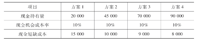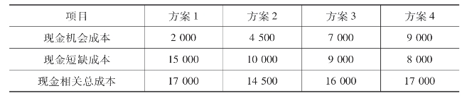 通过以上各方案的现金总成本对比可知,方案2的现金总成本最低,也就是说,当企业持有的现金量是45 000元时,各方面的现金成本总代价最低,对企业最合算,所以45 000元是该企业的最佳现金持有量。