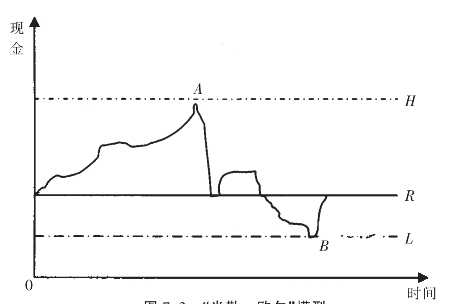 随机模式是依据企业的现金支出的随机性和在一定时期内无法确定现金需要量的情况下对现金持有量控制的方法。企业可以根据历史经验和实际需要测算出现金持有量的控制范围。“米勒—欧尔”模型如图7-3所示。当现金量达到控制上限(H线)时,用现金购入有价证券,使现金持有量下降到最优现金返回线(R线);当现金量下降到控制下限(L 线),则抛售有价证券换回现金,使现金持有量回升到最优现金返回线(R线)。