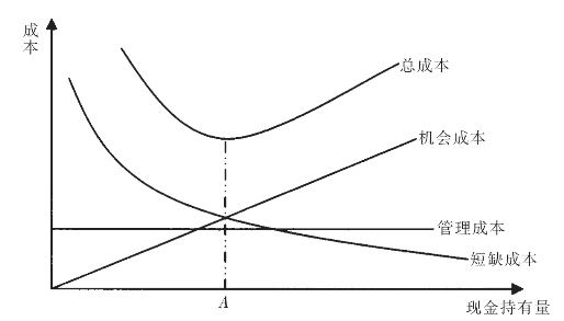 成本分析模式是通过分析持有现金的相关成本,寻求总成本最低的现金持有量,如图7-1所示。现金机会成本是一条向右上方倾斜的直线,现金短缺成本是一条向右下方倾斜的曲线,而现金管理成本是一条平行于横轴的直线,总成本是一条抛物线,现金机会成本、现金管理成本和现金短缺成本之和最小的是最佳现金持有量。图上抛物线最低点做出的虚线与横轴相交点(A)就是最佳现金持有量。在A点之前,是现金短缺成本线在现金机会成本线之上,说明了现金短缺成本上升的代价会大于现金机会成本的下降;超越A点之后,现金机会成本上升的代价会大于现金短缺成本的下降。在决策时,管理成本作为不相关成本,可不予考虑。