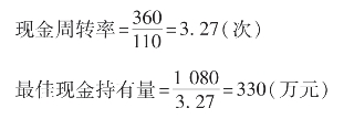 〔例7-4〕设某公司的材料采购采用赊购,产品销售采用赊销方式。其应收账款的平均收款天数为60天,应付账款的周转天数为40天,存货平均周转天数为90天,预计2019年企业现金需求量为1 080万元,计算该企业2019年的最佳现金持有量。