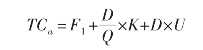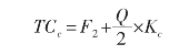储存成本也分为固定成本和变动成本。固定成本与存货数量无关,如仓库折旧、仓库职工月工资等,常用F2表示。变动成本与存货的数量有关,如存货资金的应计利息、存货的破损和变质等,单位成本用Kc表示。这样储存成本计算公式为: