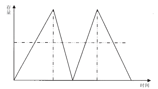3.存货陆续供应和使用。在实际工作中,原料的来源可能有两种:自制和外购。对于自制的原材料,存货是边送边用;而外购的原材料除了一次到货外,还有可能是分批陆续到货。因此在工作中,有必要对自制和外购的成本进行权衡,选其最小值。边送边用的存货数量变动如图7-6所示。