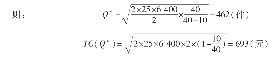 〔例7-8〕某厂每年零件需要量D为6 400件,每日送货量P为40件,每日耗用量H为10件,单价U为10元,一次订货成本(生产准备成本)K为25元,单位储存变动成本K2为2元。