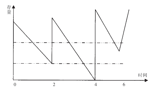 企业安全储备如图7-7所示。在0~2月中,全年日均需求量等于10件,则不需要动用安全储备;在2~4月中,全年日均需求量大于10件,需要动用安全储备;在4~6月中,全年日均需求量小于10件,不仅不需要动用安全储备,且在下批货运到前还尚未使用完毕。
