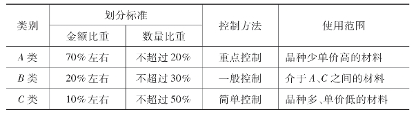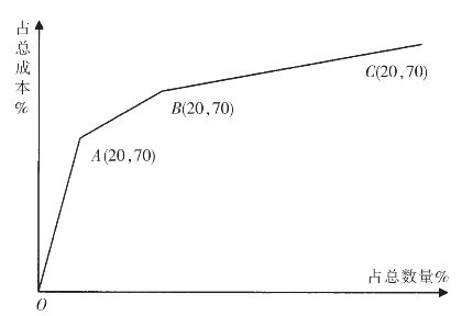 ABC分类管理法,又称为巴雷特分析法,是由意大利经济学家巴雷特于19世纪首创的分析方法,广泛运用于存货管理、成本管理和生产管理等方面。ABC分类管理法的出现是因为存货的数量和价值存在较大的差异。数量多的存货,不一定价值昂贵;数量少的存货,往往价值不菲。所以ABC分类法就是按照一定的标准(如金额标准或数量标准),按照存货单个品种在一定期间(一年内)的需用额,将企业的存货分为A、B、C三类,分清主次,区别对待。A类存货一般是数量少,但资金和价值较多的存货;C类存货是指种类繁多,但资金占用不多的存货;B类存货是介于A类和C类之间的存货。存货的ABC分析法如表7-6和图7-8所示。