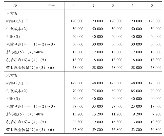 下面先计算甲、乙方案的营业现金流量,如表8-1所示。然后结合初始现金流量和终结现金流量编制两方案的全部现金流量,如表8-2所示。