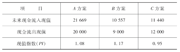 〔例8-6〕根据例8-5资料,A、B、C三个方案的现值指数计算如表8-6所示。