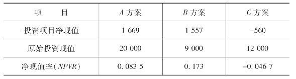 表8-5 A、B、C投资方案的净现值率计算表 单位:元