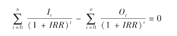 在计算方案的净现值时,以预期投资报酬率作为贴现率计算,净现值的结果往往是大于零或小于零,这就说明方案实际可能达到的投资报酬率大于或小于预期投资报酬率;而当净现值为零时,说明两报酬率相一致。根据这个原理,内含报酬率(IRR)就是要计算出使净现值等于零时的贴现率,这个贴现率就是投资方案的实际可能达到的投资报酬率。其计算公式为: