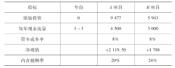 该例中,A项目净现值高但内含报酬率低,从内含报酬率角度决策应采用B项目。但是,由于两项目是互斥投资方案,尽管A项目投资额大、内含报酬率低,但在计算净现值时已经抵减了实施该项目的本金9 477元和按资本成本率8%计算的利息,因而应选择净现值大的方案A。进一步看,A项目的原始投资9 477元按资本成本率要求每年应收回3 678(=9 477÷2.577)元,实际每年收到现金流量4 500元,每年产生了822元投资报酬;B项目的原始投资5 943元按资本成本率计算的投资回收为2 306(=5 943÷2.577)元,实际每年收到的现金流量3 000元中每年产生694元投资报酬。A项目每年平均的投资报酬高于B项目,应当选择A方案。