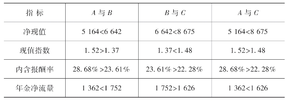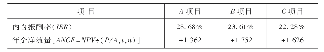 (2)B项目与C项目比较,两项目投资额相同但期限不同。同样,若企业资金不紧张,预计在中期并无其他合适的投资项目,则选择C项目。若未来投资市场较为活跃,尽管C项目净现值和现值指数大,但它是经历8年才获得的,回收期长,应先安排年金净流量和内含报酬率较高的B项目。