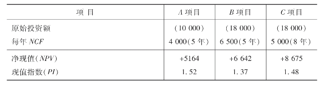 〔例8-11〕假定某企业准备投资于三个独立投资项目A、B、C,A项目需投资10 000元,期限5年;B项目需投资18 000元,期限5年;C项目需投资18 000元,期限8年。假定资本成本率为10%,其余资料如表8-10所示。问如何安排投资顺序?