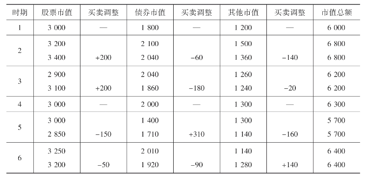 本例中,第二期三类证券的市值都有所上升,债券和其他证券的市值超过了10%,调整对象是债券和其他证券,卖出债券60万元,卖出其他证券140万元,买入股票200万元,以维持原有的投资比重。第三期证券市值总额变动虽然没有超过10%,但股票市值下跌程度超过了10%,需要进行调整。第四期各类证券市值的变化均没有超过10%,不做任何调整。第五期债券市值大幅度下跌,卖出股票和其他证券以补充债券310万元。第六期股票和债券市值的上涨幅度大,故卖出股票50万元,卖出债券90万元。