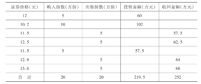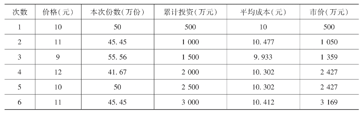 6次投资共购入A证券288.13万份,平均购买价格为10.412元(3 000万元÷288.13万份)。以后如果该证券的市价大于10.412元,便将A证券全部抛出从而获取盈利。例如,在投资期末证券市价为11元时,每份证券获利0.588元,288.13万份证券共获利169万元。按所持证券目前的市价总额3 169万元计算,比3 000万元的投资总额超出169万元,也可得到同样的结果。因此,到第六次投资期市价为11元时,不必再购买证券45.45万份,而是将原有的242.68万份全部抛售,平均成本10.302元,每份获利0.698元,共获利169万元。