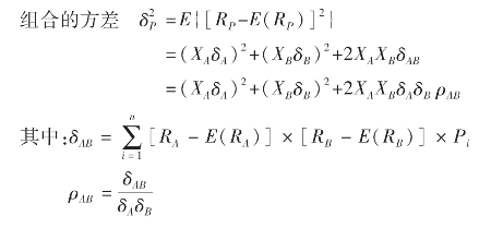 假设两种风险性证券A与B,投资者将一定比重的资金投向于A证券,剩余比重的资金投向于B证券。如果R代表证券可能的投资报酬率,E(R)代表投资报酬率的期望值,δ代表证券的标准离差,下标A、B代表不同的证券,下标P表示证券投资组合各种投资报酬情况出现的概率。则有: