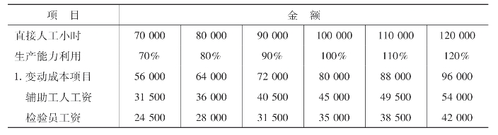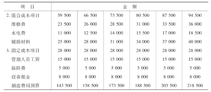 根据表11-3,可利用y=38 500+1.5x,计算出人工小时在70 000~120 000的范围内,任一业务量基础上的制造费用预算总额;也可以算出在该人工小时变动范围内,任一业务量的制造费用中某一费用项目的预算额,如,维修费y=6 000+0.25x,检验员工资y=0.35x等。