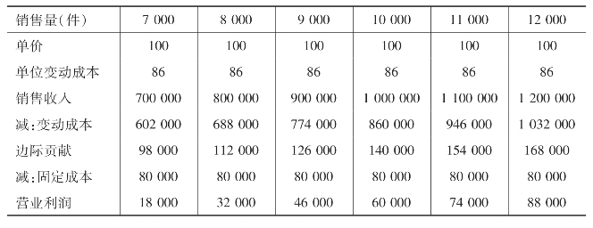 〔例11-4〕预计ABC公司预算年度某产品的销售量在7 000~12 000件之间变动,销售单价为100元,单位变动成本为86元,固定成本总额为80 000元。
