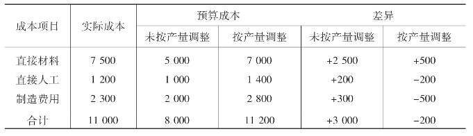在产量从1 000件增加到1 400件的情况下,如果不按变动后的产量对预算成本进行调整,就会因业务量不一致而导致所计算的差异缺乏可比性;但是如果所有的成本项目都按实际产量进行调整,也不够科学。因为制造费用中包括一部分固定制造费用,它们是不随产量变动的,即使按产量调整了固定预算,也不能准确说明企业预算的执行情况。