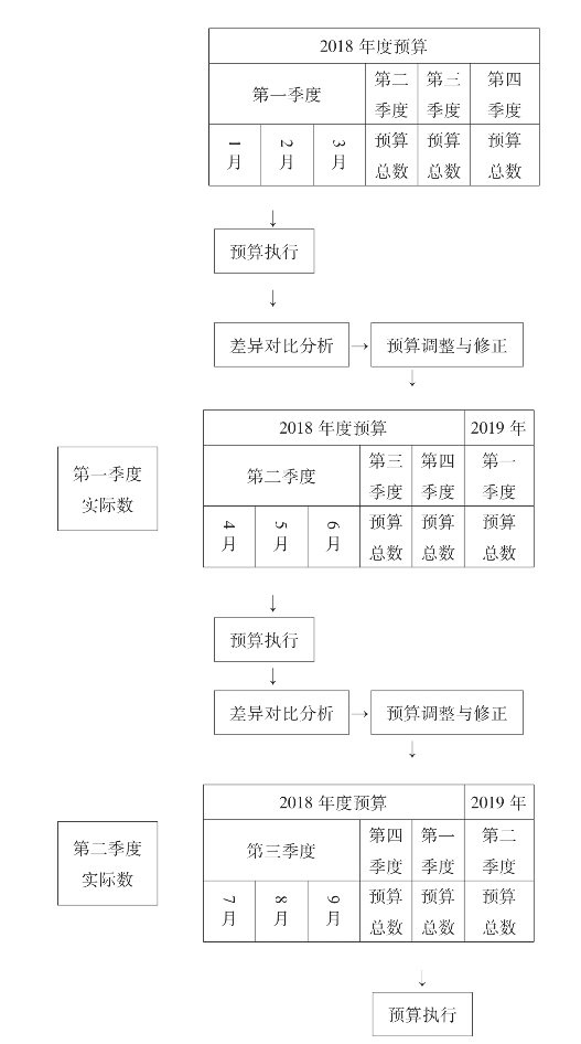 如在2018年第1季度至第4季度的预算执行过程中,需要在第1季末根据当季预算的执行情况,修订第2季度至第4季度的预算;同时补充2019年第1季度的预算;第2季度末根据当季预算的执行情况,修订第3季度至2019年第1季度的预算,同时补充2019年第2季度的预算,以此类推。
