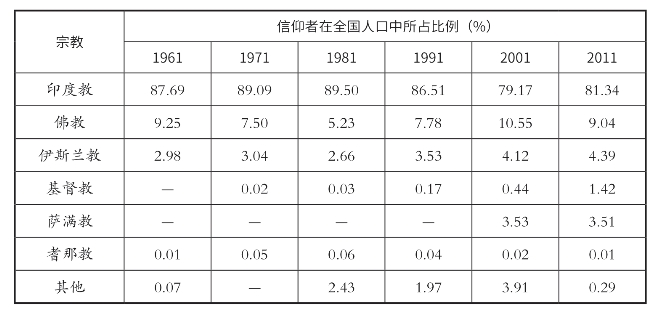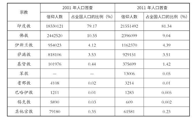 但是,从1991年以后的三次人口普查看,印度教的绝对优势有所下降,已从20世纪80、90年代的90%左右下降到80%左右,而佛教和伊斯兰教的信仰人数略有上升。基督教的人数则上升明显,2011年人口统计时已有37.57万人,占全国人口的1.42%。见下表:
