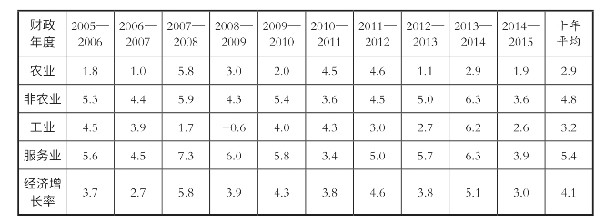 在三种产业中,农业的增长速度最慢,近十年平均年增速为2.9%,非农业为4.8%。其中服务业的增速最快,为5.4%。详见下表: