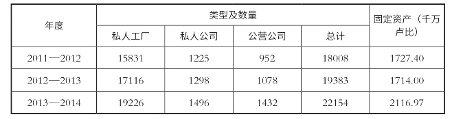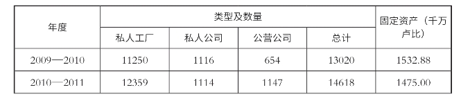 尼泊尔政府很重视家庭手工业及小型工业的发展,为此,有关部门为从业者提供必要的技术培训、贷款和信息支持等。那些经济比较落后的民族、低种姓、达利特人、残疾人以及妇女等在家庭手工业和小型工业中获得就业机会。2013—2014年度,尼泊尔共有家庭手工业及小型工业22154家,其中私营企业20722家,公营企业1432家,固定资产投资211.6亿卢比,就业人数17078人。见下表: