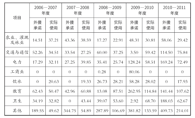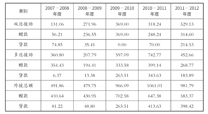 尼泊尔无论是制订财政预算或是制订五年发展计划,都把外援作为“收入”的重要来源之一。在第一个五年计划中,外援甚至占到80%,而且外援的数额也在不断增长。第一个五年计划的外援为2.672亿卢比,“二五”和“三五”增至5.213亿卢比和9.761亿卢比,“七五”计划为204.8亿卢比,“八五”增至743.55亿卢比,“九五”进一步增至1115.46亿卢比。2011—2012年度,外援总额为981.79亿卢比,其中赠款为583.37亿卢比,占外援总额的59.4%;贷款为398.42亿卢比,占外援总额的40.6%。