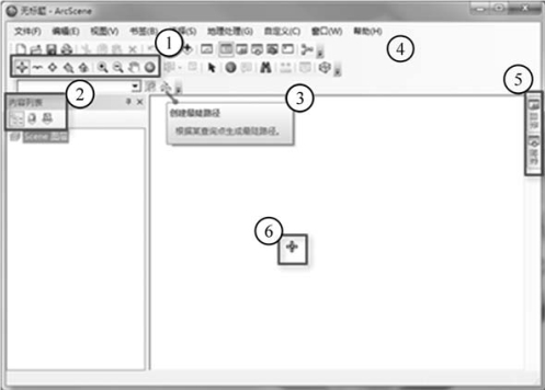 (6)导航图标⑥。它会随着在数据和3D环境中随意移动时所用导航工具的不同而变化。Arc Scene不提供任何3D Globe表面。