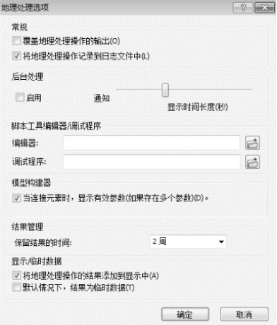 (1)将后台运行改为前台运行。具体做法是:单击“地理处理”→“地图处理选项”,在“地图处理选项”窗口中将后台处理中的“启用”钩去掉,如图3.1。