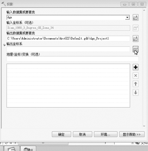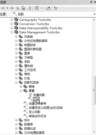 (1)首先找到投影工具,我们可以在搜索里面搜索“Project”,如图3.9,找到投影工具后,打开“投影”命令窗口,选择输入数据集或要素类,如图3.10。