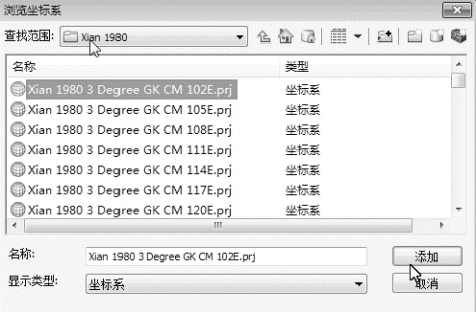 (2)选择“输出坐标”→“选择”→“Projectde Coordinate Systems”→“Gauss Kruger”→“Xian 1980”,选择中央经线是102的,如图3.11。
