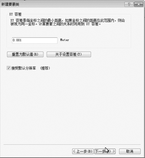 (5)添加坐标系以后,点击“下一步”,在“新建要素类”命令窗口中设置“XY容差”,这里我们设置0.001,如图3.18。