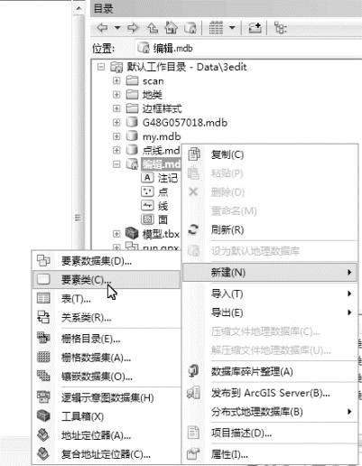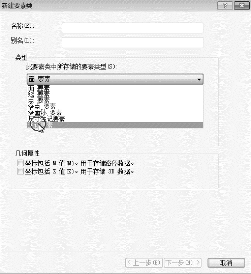 (2)新建要素类。选择一个地理数据库→“新建”→“要素类”,打开“新建要素类”命令窗口,在“类型”里选择“注记要素”,具体如图3.15。