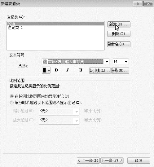 (7)点击“下一步”,新建注记类,可以设置字体大小,如图3.20和图3.21。