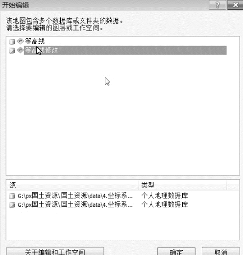 (2)单击“编辑器”→“开始编辑”,打开“开始编辑”命令窗口,注意要修改哪个数据就选择哪个数据,这里我们选择“等高线修改”数据,如图4.2。