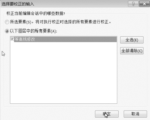 (5)单击“空间矫正”→“设置矫正数据”,打开“选择要矫正的输入”命令窗口,点选“以下图层中的所有要素”,选择“等高线修改”,如图4.5。