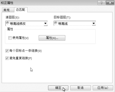 (6)单击“空间矫正”→“选项”,打开“矫正属性”命令窗口,在常规中,方法设置成“平滑”,如图4.6;在边匹配中,源图层选择“等高线修改”,目标图层选择“等高线”,如图4.7。