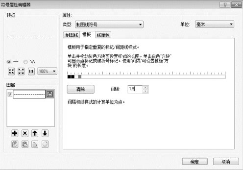 (2)在“属性”中,选择“制图线符号”类型,单位选择毫米;在“制图线”中将线宽设置成0.12 mm,将线的颜色设置成黑色;在“模板”中设置成如图5.1所示。