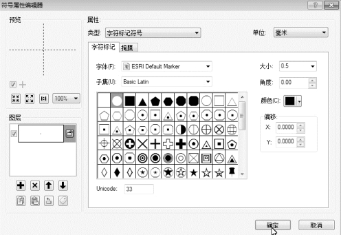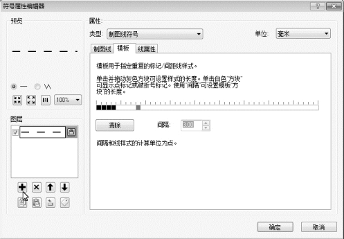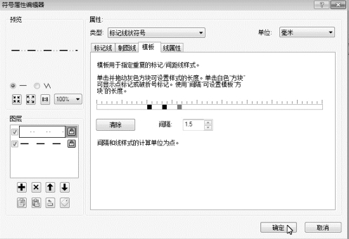 (1)添加线要素图层,打开“符号选择器”命令窗口,然后选择编辑符号,打开“符号属性编辑器”,制作出如图5.16所示的两个组成部分。需要注意的是第一个部分在“类型”中选择“标记线状符号”,间隔设置为1.5,使用的是点,点击“标记线”→“符号”,在“字符标记”中选择第一个字符,设置大小为0.5,如图5.17。